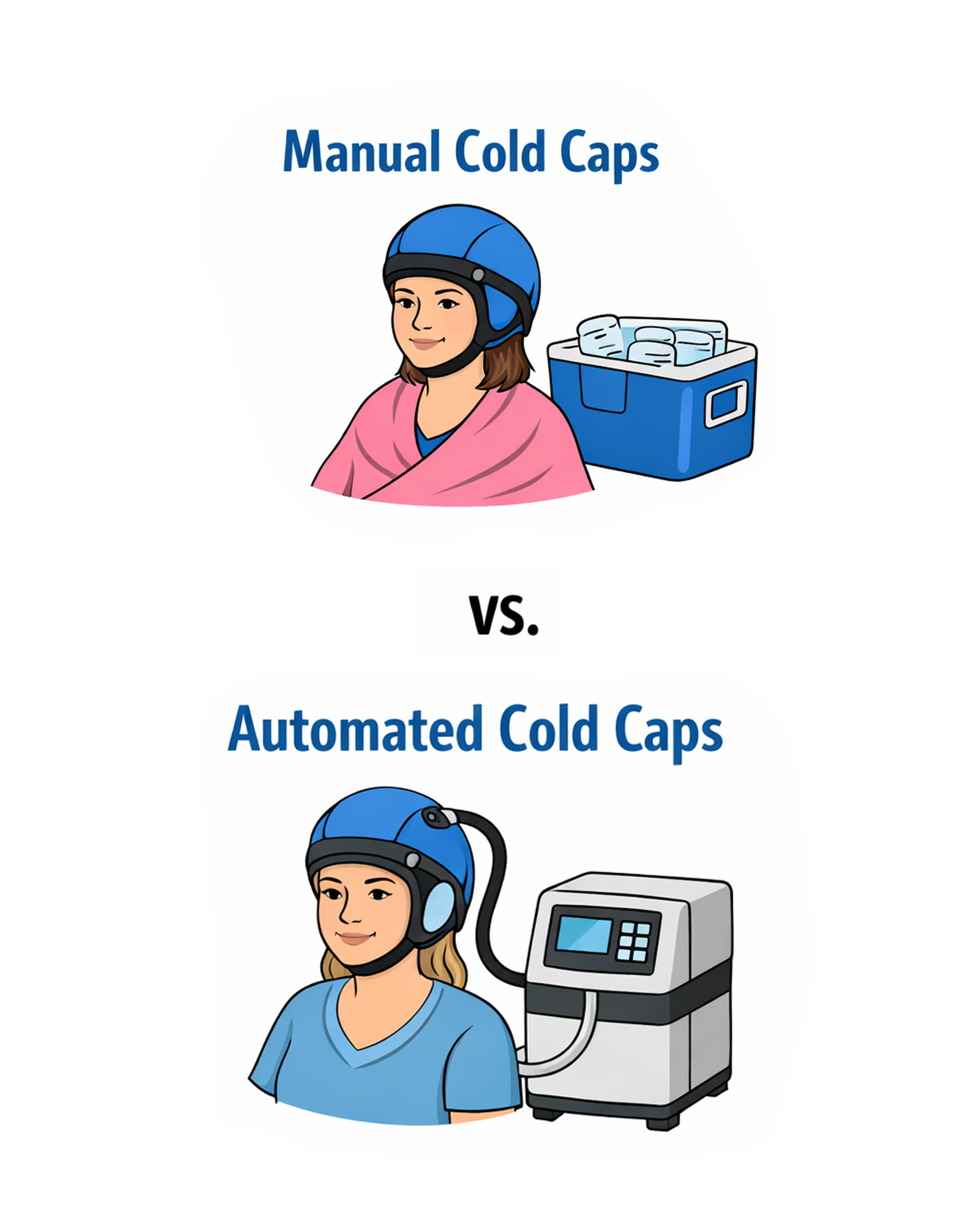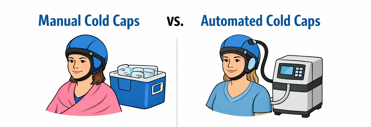Automated cold caps include self-contained refrigeration units that continuously cool the cap during treatment. This approach does not require cap changes, access to freezers, or dry ice. Although, this option is not available to every area.